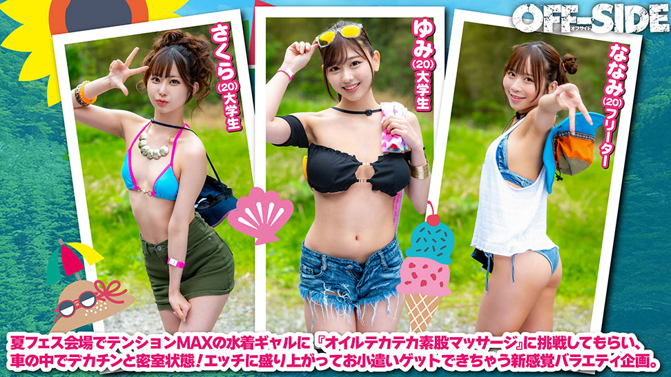 夏フェスに来ていた水着ギャルをナンパして初めて会うデカチン男とすぐに仲良しになれちゃうオイルテカテカマッサージに挑戦してもらっちゃいました!マッチング車で二人っきり!お互いマッサージをし合って仲良くなると…1人目のゆみちゃん(20)大学生は推定Hカップの爆乳&美乳おっぱいが恥ずかしそうにポロロンしちゃって大興奮!2人目さくらちゃん(20)大学生は関西訛りでノリが良い!敏感そうな乳首が美味しそう!3人目ななみちゃん(20)フリーターは小柄で華奢なのに推定Fカップの巨乳ちゃんでスケベが大好きな乳輪をしています!ちょっとエッチモードになった女子たちの目の前にデカチン登場すると思わずこぼれる笑み!絶対に興奮しています!そして、オイルテカテカの素股マッサージが始まると…みんなこっそり即ハメしちゃってる!!挿入したら、もう遠慮はいりません!パイズリ、バック挿入!何度も絶頂して狂喜乱舞!M字丸見せ騎乗位で中出し!さらに正常位でお口発射!首まで垂れるほどの超濃厚大量発射!!!「デカチン!サイコーっ!ピース!!!」やっぱりみんな仲良しになってくれました!